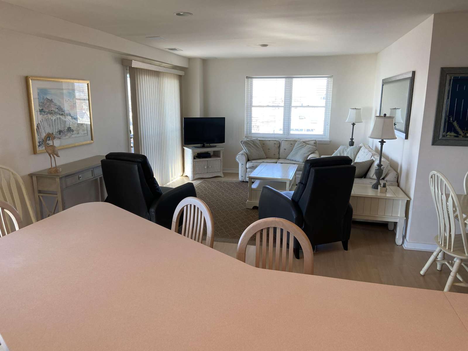 Largest unit in The Tides! 3 bedrooms and 2 full baths (walk-in shower in Master BR, tub in hall bathroom). This unit sleeps 8 with a king in the master bedroom, queen in the 2nd bedroom, and a pyramid (twin over full) and a single bed in the 3rd bedroom. Enjoy the open floor plan in this top floor unit with panoramic views of the ocean, lighthouse and historic Cape May. Beautifully furnished with 2 large smart flat screen TVs (living room and Master bedroom). Enjoy beautiful sunsets! Standard and Keurig coffee maker.
